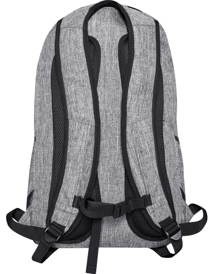 600D Polyester Rucksack in Grey Melange. Ein Hauptfach mit 2-Wege-Reißverschluss und separatem, gepolstertem Laptop-Fach mit Klett-Verschluss. Zwei weitere 2-Wege-Reißverschluss-Taschen auf der Front; eine größere mit zusätzlichem Fach und eine kleinere mit praktischen Organizer-Fächern. Zwei offene Seitentaschen mit Gummizug. Ergonomisch geformte, verstellbare und gepolsterte Schultergurte. Verstellbarer Brustgurt mit Klick-Verschluss. Rücken stark gepolstert. Obenliegender Tragegriff. Alle Reißverschlüsse in Schwarz, Gummi-Zipp-Puller mit „bags2GO“-Prägung. Laptop-Fach: bis 15 Zoll. Volumen: ca. 28 Liter.