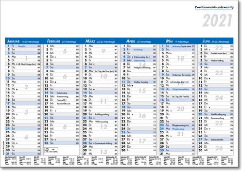 TAFELKALENDER | Wandkalender 6 Monate pro Seite | Sprache D | Druck bau/schwar oder rot/schwarz | Kalendarium mit deutschen Feiertagen, Ferientermine