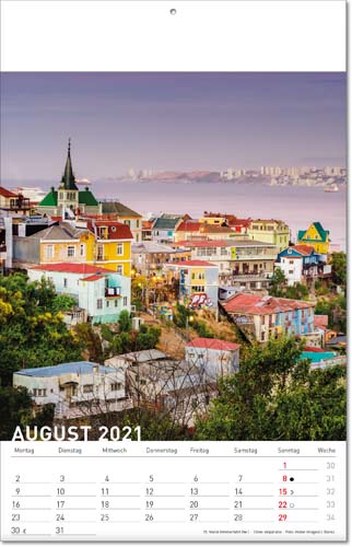 Bildkalender deutsch REISEZIELE mit Klappfälzel | Papier: 100 g Bilderdruck glänzend | Rückwand 400 g Graukarton | Format: 24 x 37,5 cm | mit Reiseinformationen auf den Rückseiten