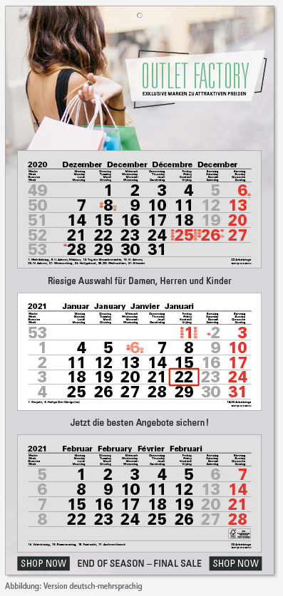 JUNIOR-3 | flatbarer 3-Monats-Kalender | deutsch-mehrsprachig | Farbe für Vor u. Nachmonat grau oder blau | Hauptmonat weiß | Metallöse | Datumweiser umgelegt | Rückwand mit internationaler Feiertags- und deutscher Ferienübersicht