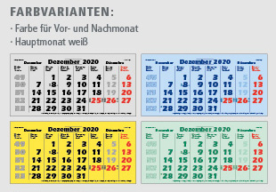 QUATTRO | flatbarer 4-Monats-Kalender | deutsch-mehrsprachig | Aufhängelochung mit Metallöse | Farbe für Vor u. Nachmonat grau-blau-gelb o. Grün | Hauptmonat weiß | Datumsweiser umgelegt