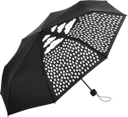 Einfache Handhabung durch Sicherheitsschieber, Windproof-Features für höhere Gestell-Flexibilität und bessere Windsicherheit | Bezug mit Spezialdruck auf zwei Keilen (weißes Regenwolken-Motiv bei Trockenheit sichtbar, farbiger Regenbogen-Unterdruck bei Nässe sichtbar) | Soft-Touch-Griff mit Werbeanbringungsmöglichkeit. Auch als Stockschirm erhältlich (Art. 1142C).
