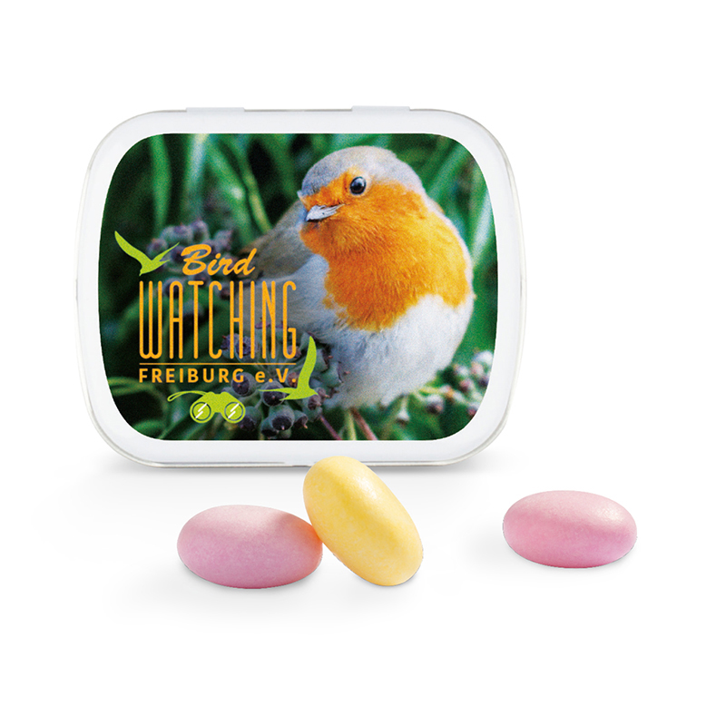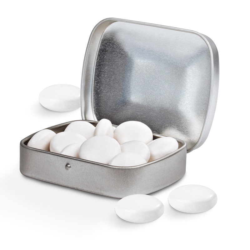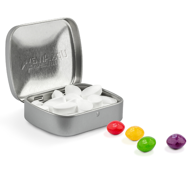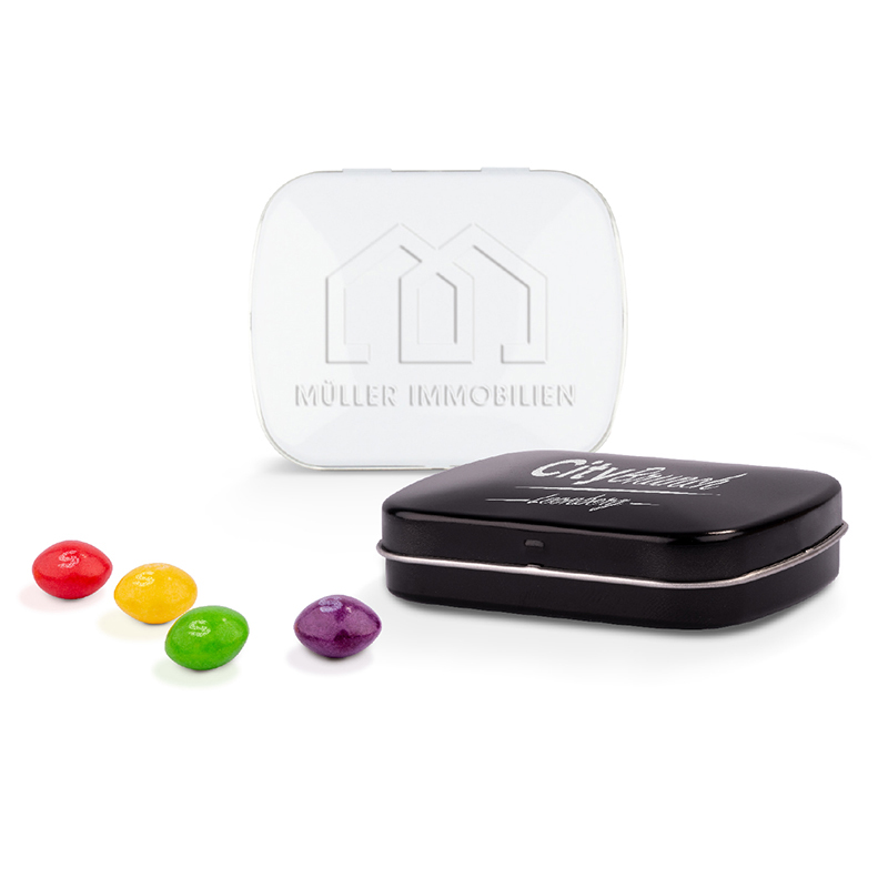 Scharnierdeckeldose mit gewölbtem Deckel | aus Metall | Mit Originalitätsverschluss und Aufreißperforation | Inhalt: Micro Bonbons, 19 g | Haltbarkeit: 36 Monate