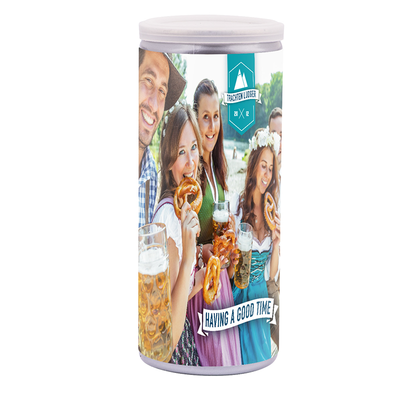 Knabber-Mix oder Mini Salzbrezeln in 100 % recycelbarer PET Dose mit Deckel | individuell bedruckt. Frischeversiegelt mit Aufreißdeckel | Knabber Mix 55 g oder Mini Salzbrezel 45 g | Haltbarkeit: 6 Monate