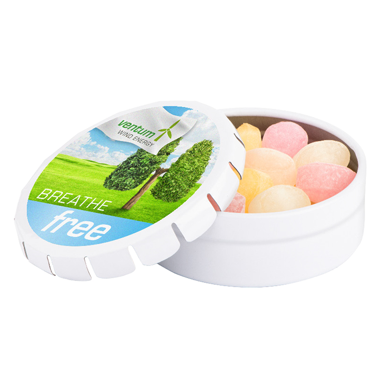 Runde Dose mit Springdeckel, weiß aus Metall mit verschiedenen Füllvarianten | individuell bedruckt | Originalitätsverschluss und Aufreißperforation | zuckerfreie Pfefferminzpastillen 12 g | Haltbarkeit:18 Monate