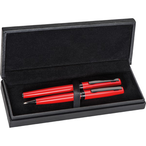 Metall-Schreibset bestehend aus einem Drehkugelschreiber mit Großraummine und einem Rollerball. Geliefert werden die Schreibgeräte in einer eleganten schwarzen Box*. Ihre Werbung wird rechts vom Clip gelasert. Die Laserkosten verstehen sich für beide Schr