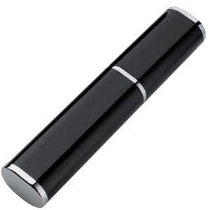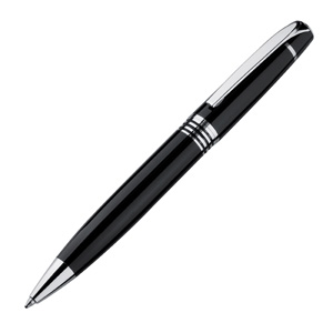 Edler Drehkugelschreiber aus Metall mit blau schreibender Großraummine in einer hochwertigen schwarzen Metallbox. Ihre Werbung lasern wir auf das Oberteil des Kugelschreibers rechts vom Clip.
