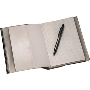 Notizbuch (160 Seiten) mit PVC Umschlag geeignet zur Bedienung des Smartphones (Touchfunktion sowie Telefonieren durch die Folie), inklusive Kugelschreiber, mit diversen Fächern und extra Ausgang für Kopfhörer. Ihre Werbung wird auf den Umschlag gedruckt.