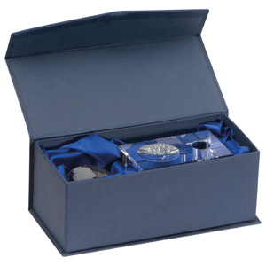 Massiver Stiftehalter aus Glas mit abnehmbarer Weltkugel. Sicher in einer blauen Box* verpackt. Ihre Werbung lasern wir von hinten auf das Glas.