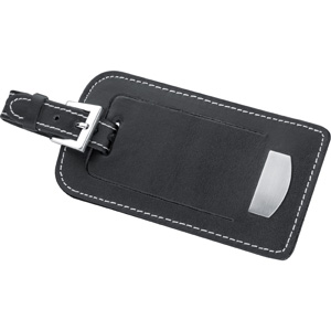 Hochwertiger Kofferanhänger aus Lederfaserstoff mit Metallplättchen, verdecktem Adressfeld und Ziernaht. Ihre Werbung lasern wir dezent auf das Metallschild.