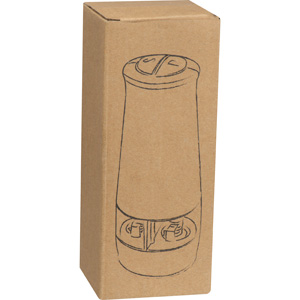 Elektrische Salz- und Pfeffermühle aus Edelstahl, gummiert. Die beiden Kompartments lassen sich durch die zwei Druckknöpfe separat bedienen. Die Werbung wird direkt auf die Mühle gelasert.