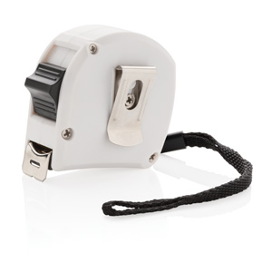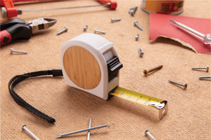 Das 5m/19mm Massband aus Bambus und ABS mit Rubber-Finish hat nicht nur einen Stop-Knopf sondern auch eine Handschlaufe und einen Gürtelclip.