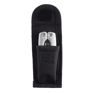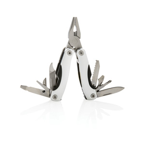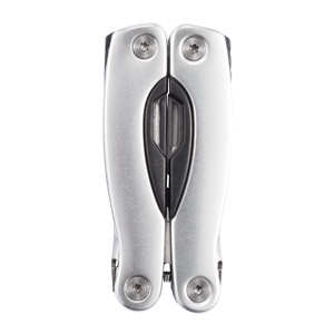 13 Funktionen, ein Multifunktionswerkzeug aus Edelstahl und mit Aluminium überzogenem Griff. Inklusive schwarzer Tasche.