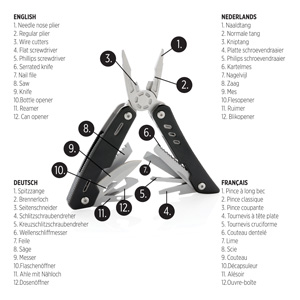 Multitool im Aluminium-Case mit 12 Funktionen aus Stainless Steel wie eine Feile, Zange, Messer, Schraubendreher, Säge, Dosenöffner und vielem mehr. In Geschenkbox verpackt.