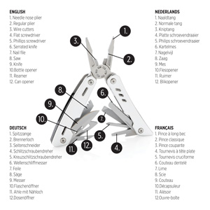 Multitool im Aluminium-Case mit 12 Funktionen aus Stainless Steel wie eine Feile, Zange, Messer, Schraubendreher, Säge, Dosenöffner und vielem mehr. In Geschenkbox verpackt.
