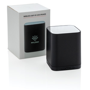 3W wireless Lautsprecher, der mit Ihrem Logo individuell gestaltet werden kann. Bei Gebrauch des Lautsprechers leuchtet das Logo auf und setzt Ihr Logo optimal in Szene. Der Lautsprecher verfügt über BT 4.2 mit einer Reichweite von bis zu 10 Metern. Die e