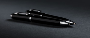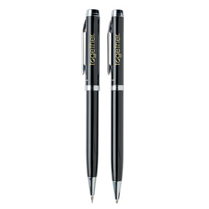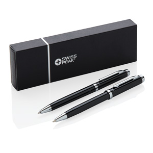 Elegantes Schreibset aus Kugelschreiber und Bleistift. 1200m blauschreibender, deutscher Tinte und der Bleistift mit 3 Minen von 0,7mm Stärke. Verpackt in Swiss Peak Geschenkbox.